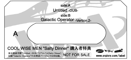 3rd Album "Salty Dinner " GLOR-0018 ¥2,625(税込) 2006.06.10 on sale!! Produced by Cool Wise Men Recorded & Mixed by 内田直之 Mastered by Masayo Takise(M's disk)including 11 songs :