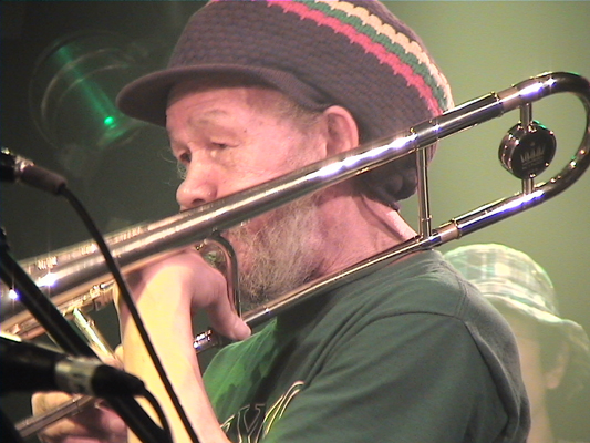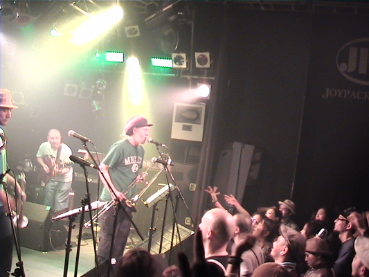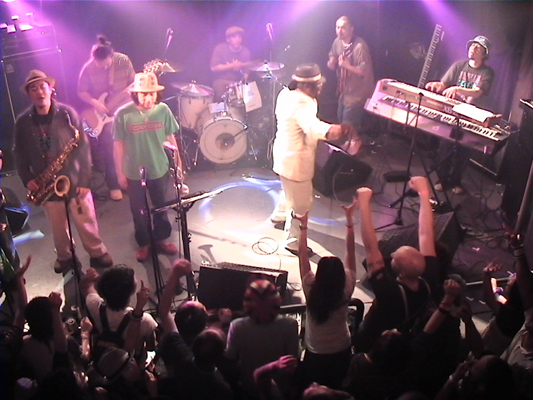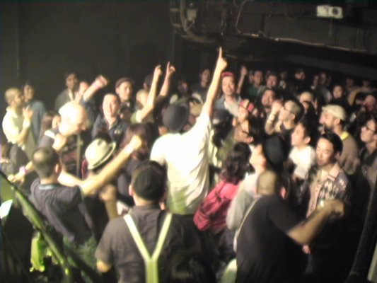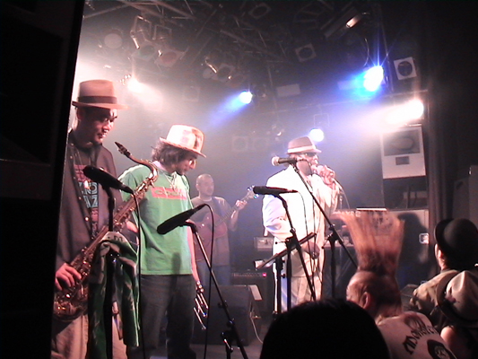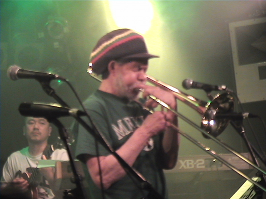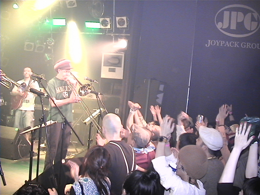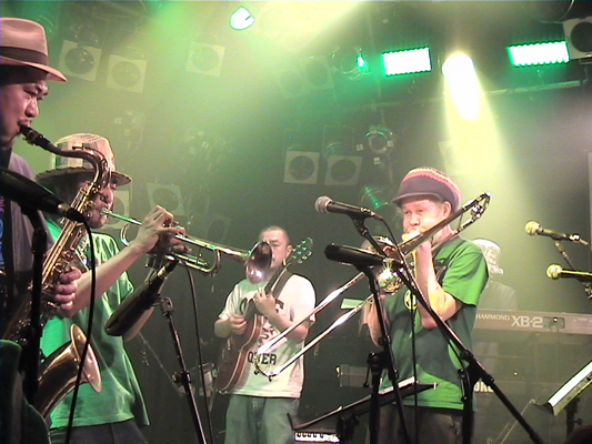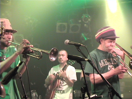 4/30心斎橋QUATTRO,5/2下北沢BASEMENTに続いて3日目となるこの日の公演スキンズのお客さんもいてすごい盛り上がりました。ROYは今回が初アジア、初日本ということです。SYMARIPのSKINHEAD MOON STOMPは世界で数百万枚というメガヒット!MR.SYMARIPことROYはそのヴォーカリスト。まさにKING OF SKINHEADなのです。英国紳士な彼はかなりのシャレ者、ステージスーツ、ディテールは勿論、楽屋での立ち振る舞いもVery Cool!!いやかっこ良かったです。お客さんを楽しませることをホント考えてるんだろうなぁと伺えるステージも流石。そんなROYは昔RICOにトロンボーンを教えてもらっていたらしく、この日は久しぶりの子弟再会。本番終了後楽屋でRICOとのエピソードで饒舌なるROY。当時のRICOはかなり厳しかった様です。